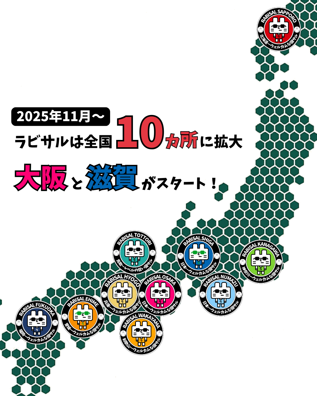 来たる11/22(土)に守山市での初開催となりますが、現在ラビサルは下記の8拠点で活動をしています。同時期にスタートする大阪と合わせて滋賀で10拠点目!